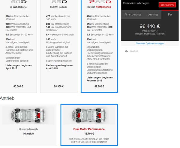 Wenn man all diese Zusatzpakete dazu bucht, kommt man auf einen Preis von 118.190 Euro – aber dafür hat man ein Elektroauto Tesla Model P85D mit allem Schnick-Schnack.